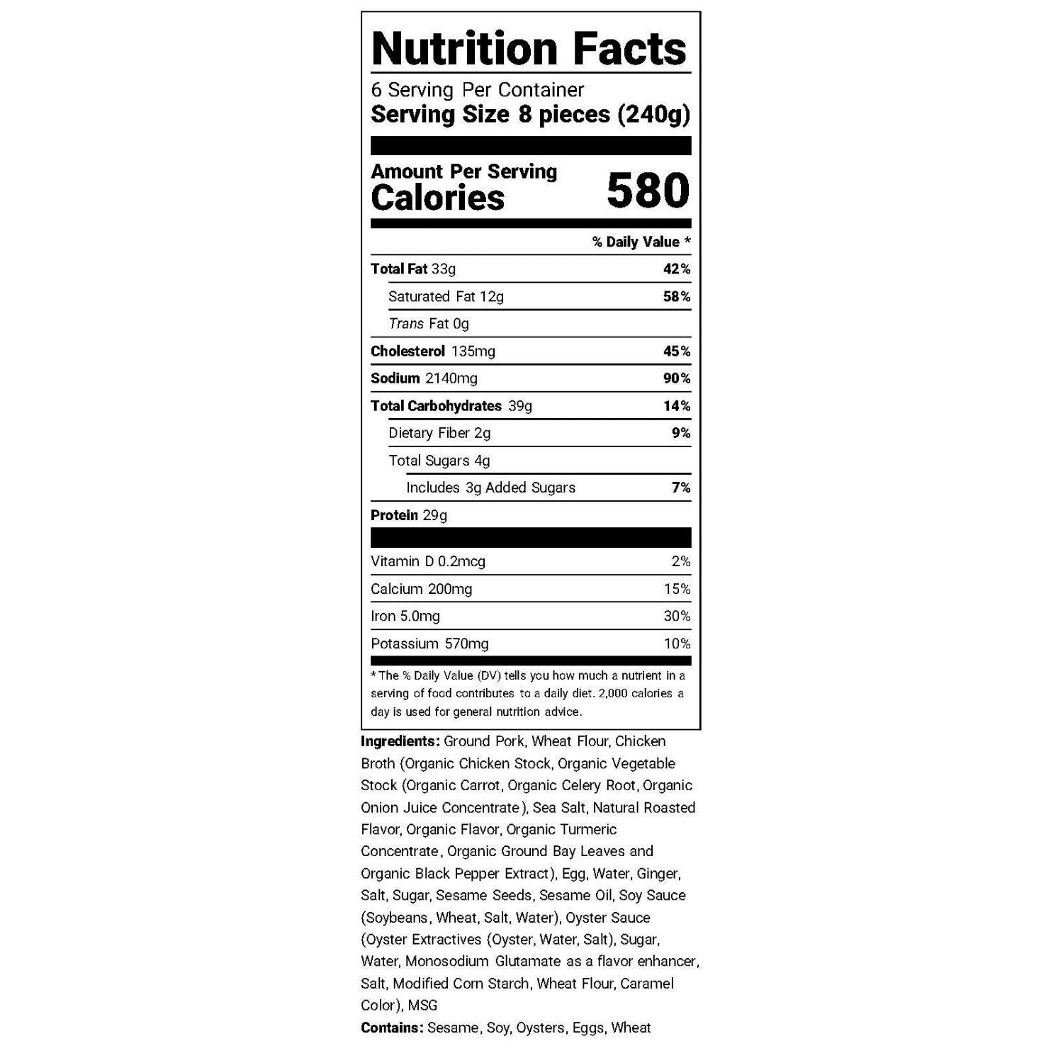 Ingredients: Ground Pork, Wheat Flour, Chicken Broth (Organic Chicken Stock, Organic Vegetable Stock (Organic Carrot, Organic Celery Root, Organic Onion Juice Concentrate), Sea Salt, Natural Roasted Flavor, Organic Flavor, Organic Turmeric Concentrate, Organic Ground Bay Leaves and Organic Black Pepper Extract), Egg, Water, Ginger, Salt, Sugar, Sesame Seeds, Sesame Oil, Soy Sauce (Soybeans, Wheat, Salt, Water), Oyster Sauce (Oyster Extractives (Oyster, Water, Salt), Sugar, Water, Monosodium Glutamate as a flavor enhancer, Salt, Modified Corn Starch, Wheat Flour, Caramel Color), MSG